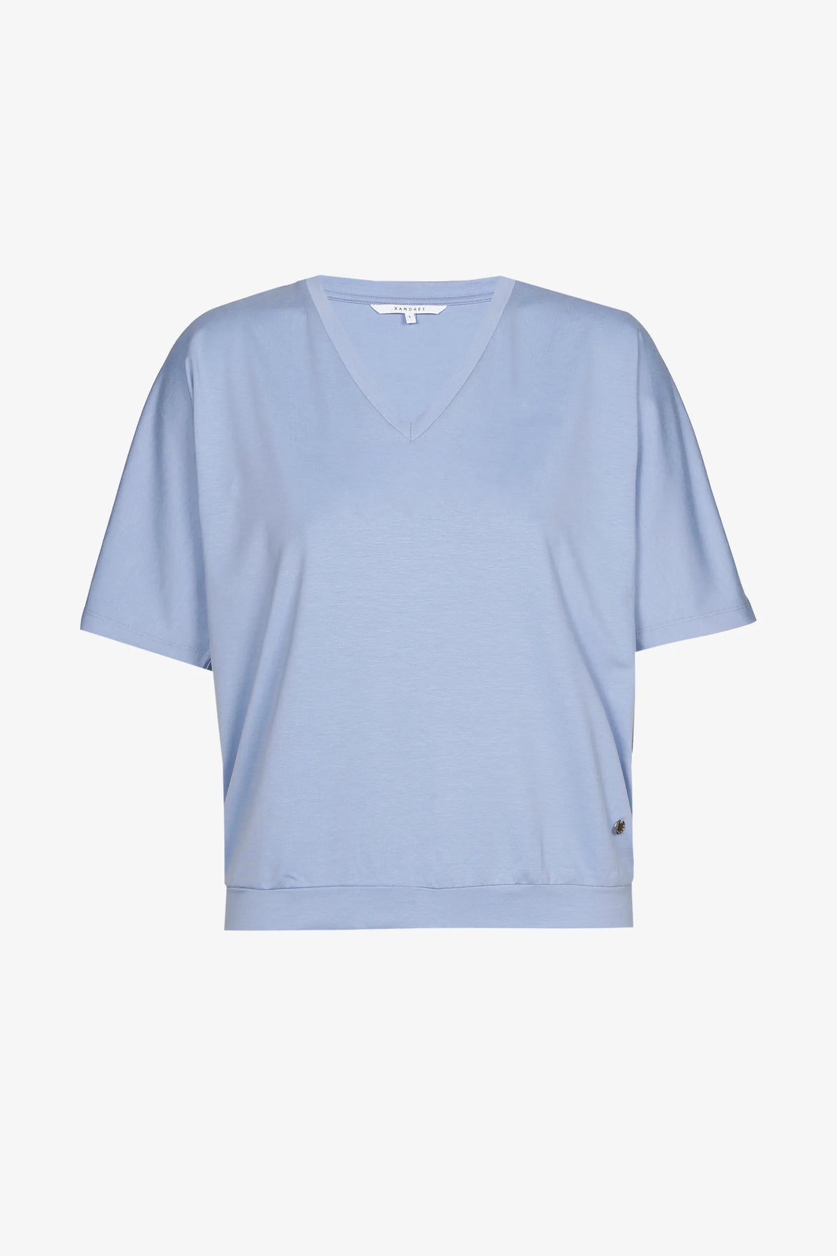 Deze verfijnde lichtblauwe T-shirt van Xandres Gold is hét voorbeeld van hoe comfort en elegantie samenkomen in één item. Met zijn vrouwelijke V-hals, ontspannen pasvorm en zachte glans is dit shirt een onmisbaar basisstuk in je garderobe, dat tegelijk stijlvol én veelzijdig is. Dankzij de dropped shoulders en de wijde, aangesneden mouwen heeft deze top een relaxte, nonchalante uitstraling die je zowel casual als gekleder kan dragen. Draag hem los op een jeans of combineer met een stijlvolle pantalon voor een eigentijdse, elegante look.