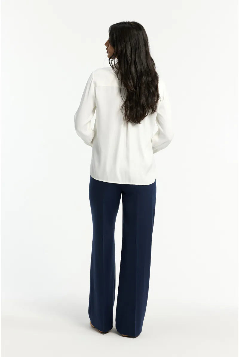 De lange mouwen met manchetten geven het hemd een verfijnde afwerking. Ze zorgen voor een elegante balans tussen casual en chic, waardoor dit stuk geschikt is voor zowel werk als vrije tijd. De achterkant is licht langer en heeft een subtiele plooi, wat extra bewegingsvrijheid en comfort biedt.