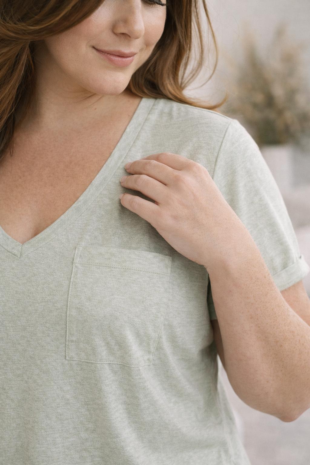 De losse pasvorm zorgt voor een flatterend silhouet en geeft ruimte aan de rondingen, wat dit model zeer geschikt maakt binnen het segment grote maten dameskleding. De korte mouwen zijn licht opgerold voor een nonchalante, moderne touch, en de borstzak voegt een subtiel detail toe zonder de eenvoud van het ontwerp te doorbreken. De diepe V-hals verlengt optisch de halslijn en geeft het shirt een vrouwelijke uitstraling die perfect past binnen stijlvolle mode voor curvy vrouwen.