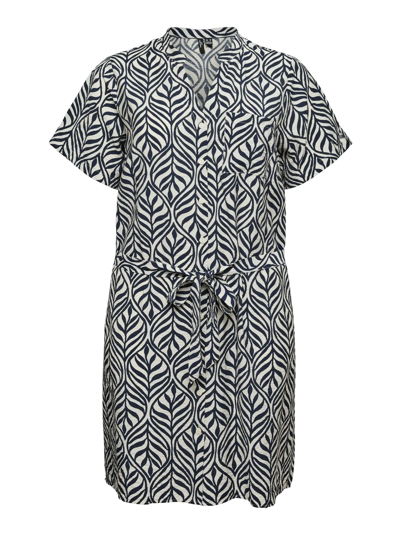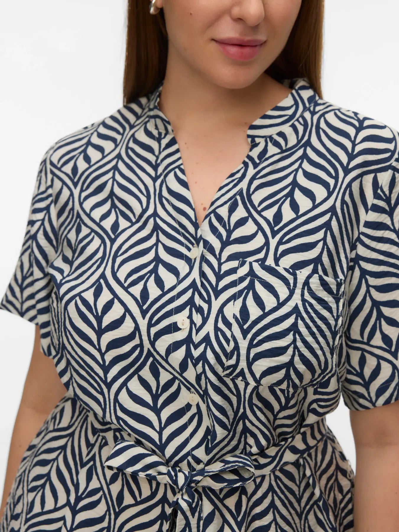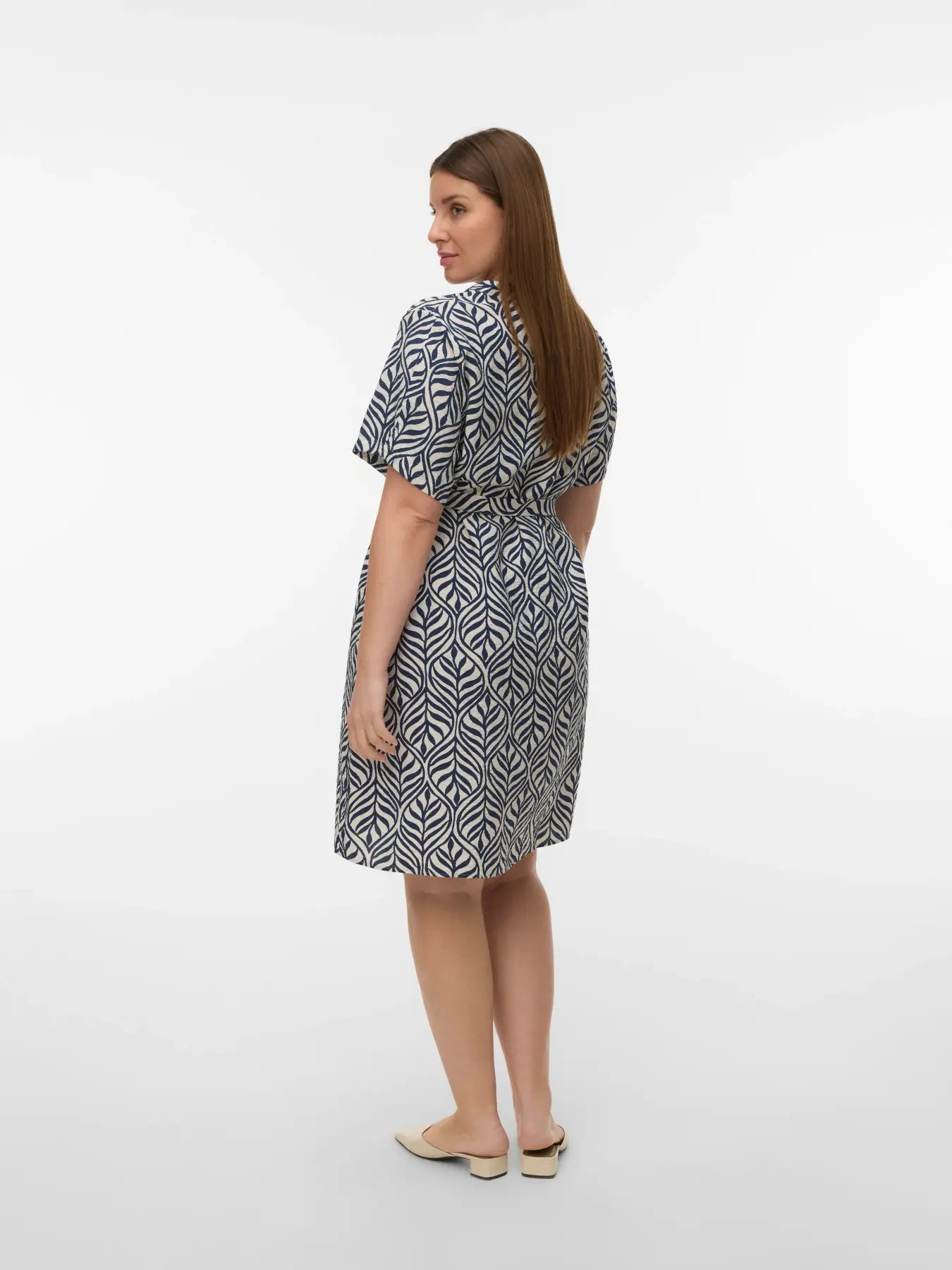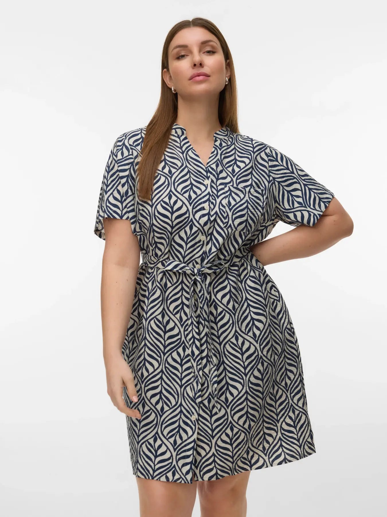 De jurk heeft een korte lengte en een regular fit die soepel rond het lichaam valt. De V-hals zorgt voor een open en elegante look die het bovenlichaam mooi laat uitkomen. De korte, wijde mouwen geven het geheel een luchtige en ontspannen uitstraling, ideaal voor warmere dagen of een casual dagje uit. Over de volledige jurk loopt een opvallende bladprint in diepblauw op een zachte lichte achtergrond. Dit natuurlijke patroon geeft de jurk een speelse, moderne uitstraling die perfect past binnen plussize fashion en een frisse twist geeft aan klassieke damesmode.