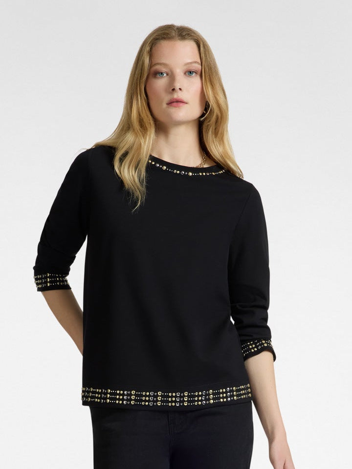 Dit plussize T-shirt met 3/4 mouwen valt losjes om het lichaam en is ideaal voor elk seizoen. De fijne, ronde halslijn en de rechte zoom zijn afgewerkt met een verfijnde rij goudkleurige studs, die een subtiel vleugje glamour toevoegen zonder over the top te zijn. Perfect te dragen als casual chic item met een jeans of als stijlvol detail onder een blazer of mantel.