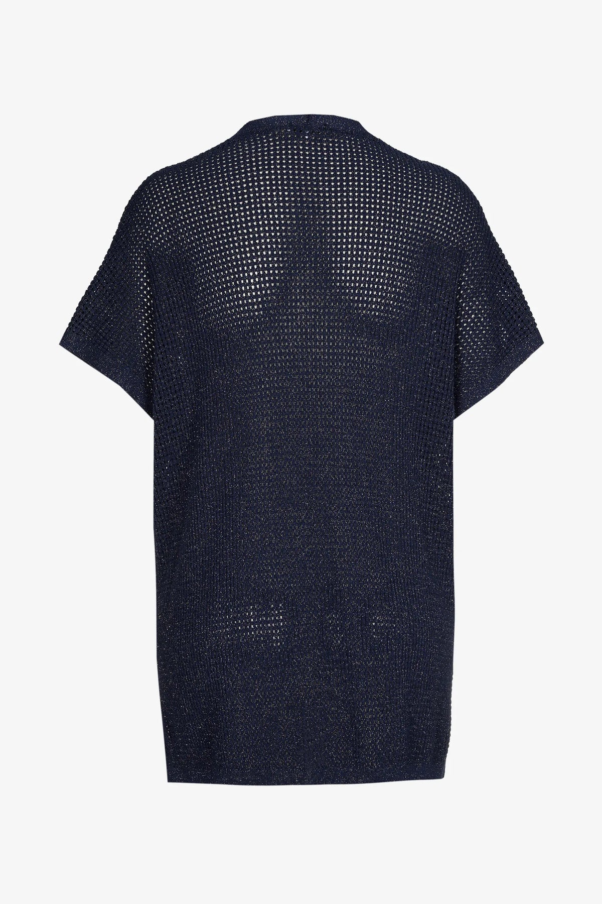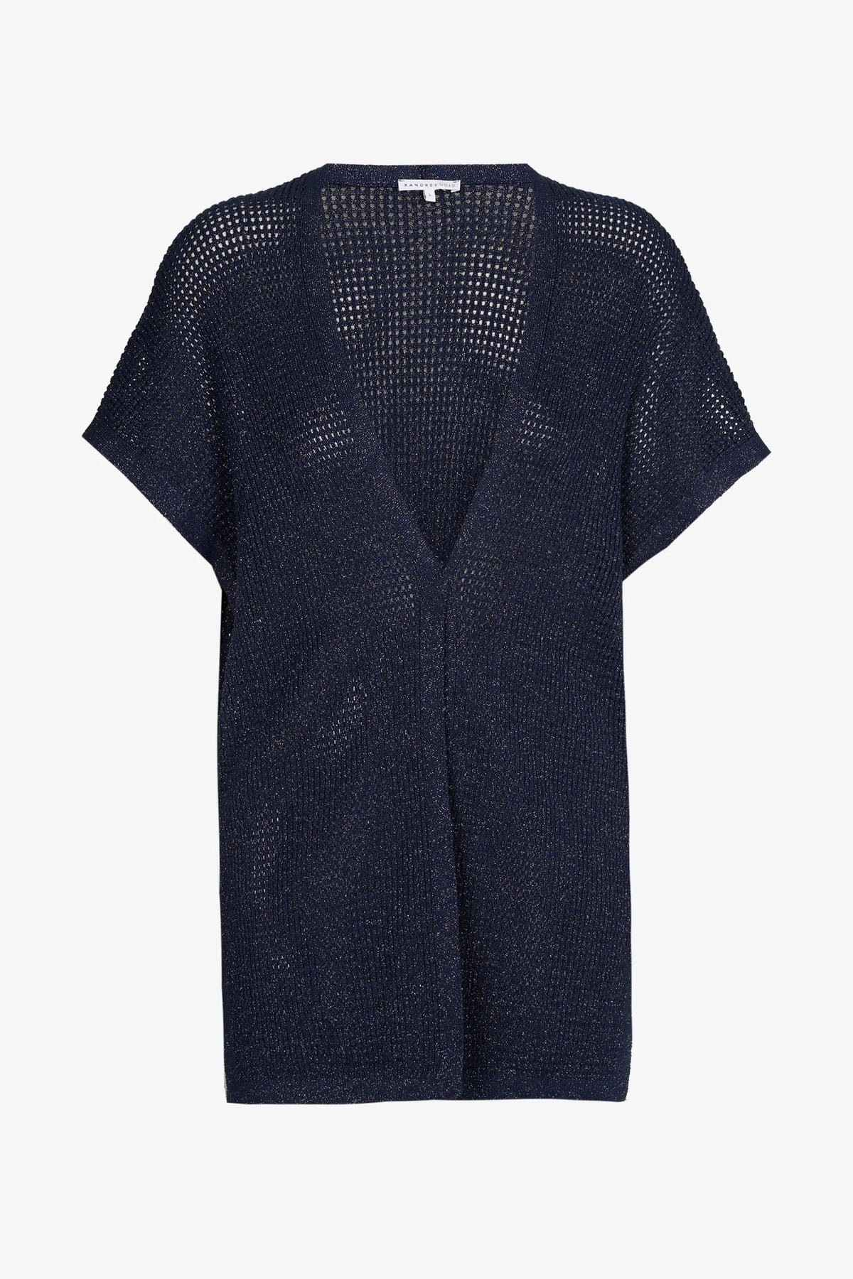 Dit navykleurige gilet van Xandres is een subtiel sprankelend en stijlvol item binnen de collectie plussize fashion. De diepe, klassieke blauwe kleur wordt verfijnd afgewerkt met ingeweven glitterdraad die het geheel een vrouwelijke, elegante flair geeft zonder te overdrijven. Dankzij de opengewerkte textuur en de zachte, soepele breistructuur voelt het luchtig aan, ideaal voor laagjes tijdens elk seizoen. De open snit en rechte pasvorm geven dit gilet een flatterende, comfortabele uitstraling die moeiteloos past binnen de wereld van stijlvolle mode voor curvy vrouwen.