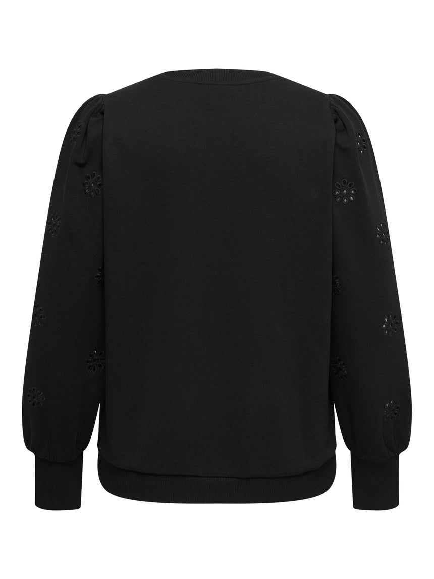 Gemaakt van een zachte mix van 60% katoen en 40% polyester, biedt deze sweater een heerlijk draagcomfort. De ronde halslijn en de iets kortere, regular fit pasvorm zorgen ervoor dat hij mooi op de heup valt, perfect in balans met de volumineuze mouwen. De broderie – geïnspireerd op bloemenpatronen – is speels maar chic, en geeft deze zwarte trui een vrouwelijke uitstraling die niet onopgemerkt blijft.