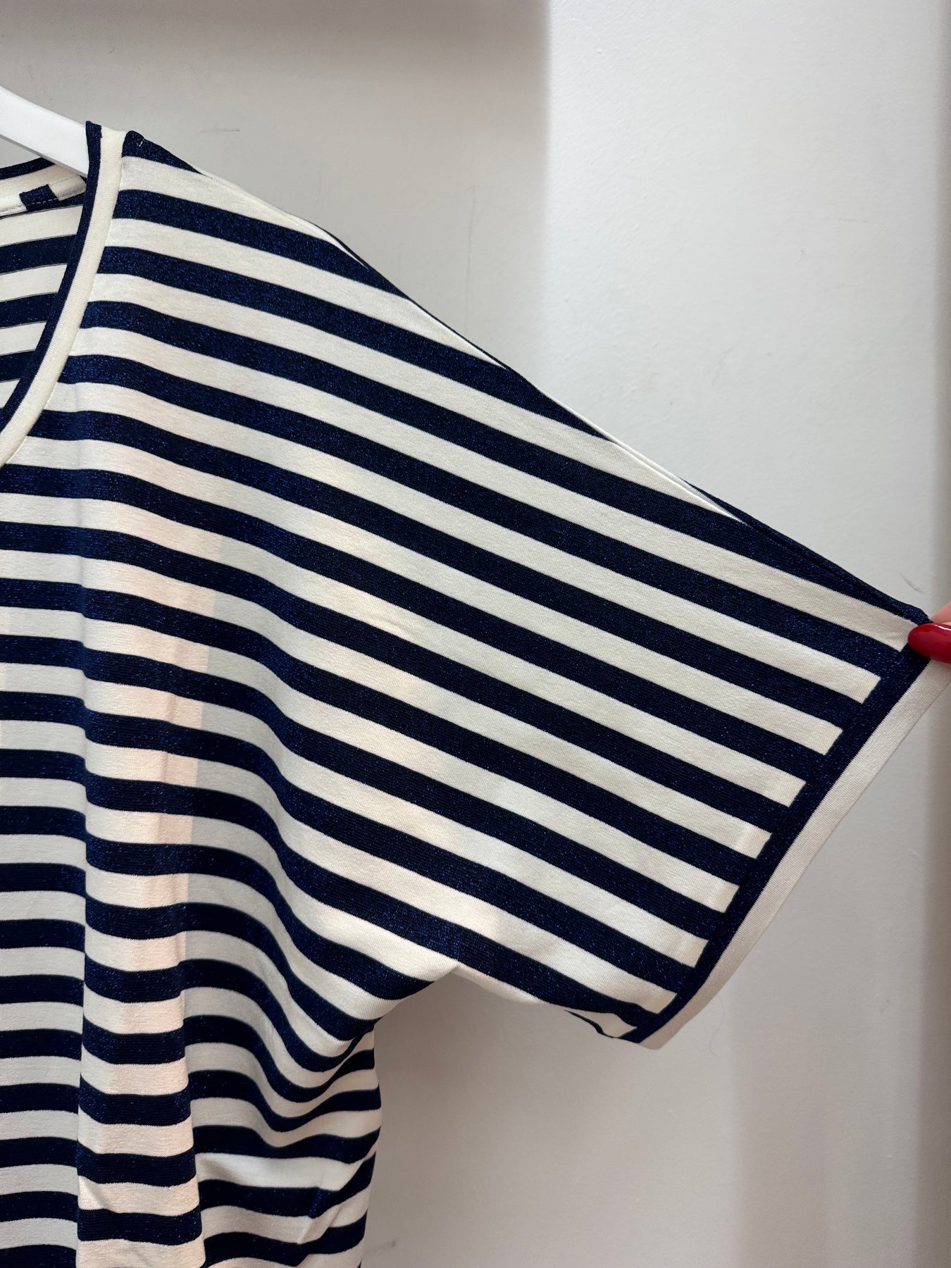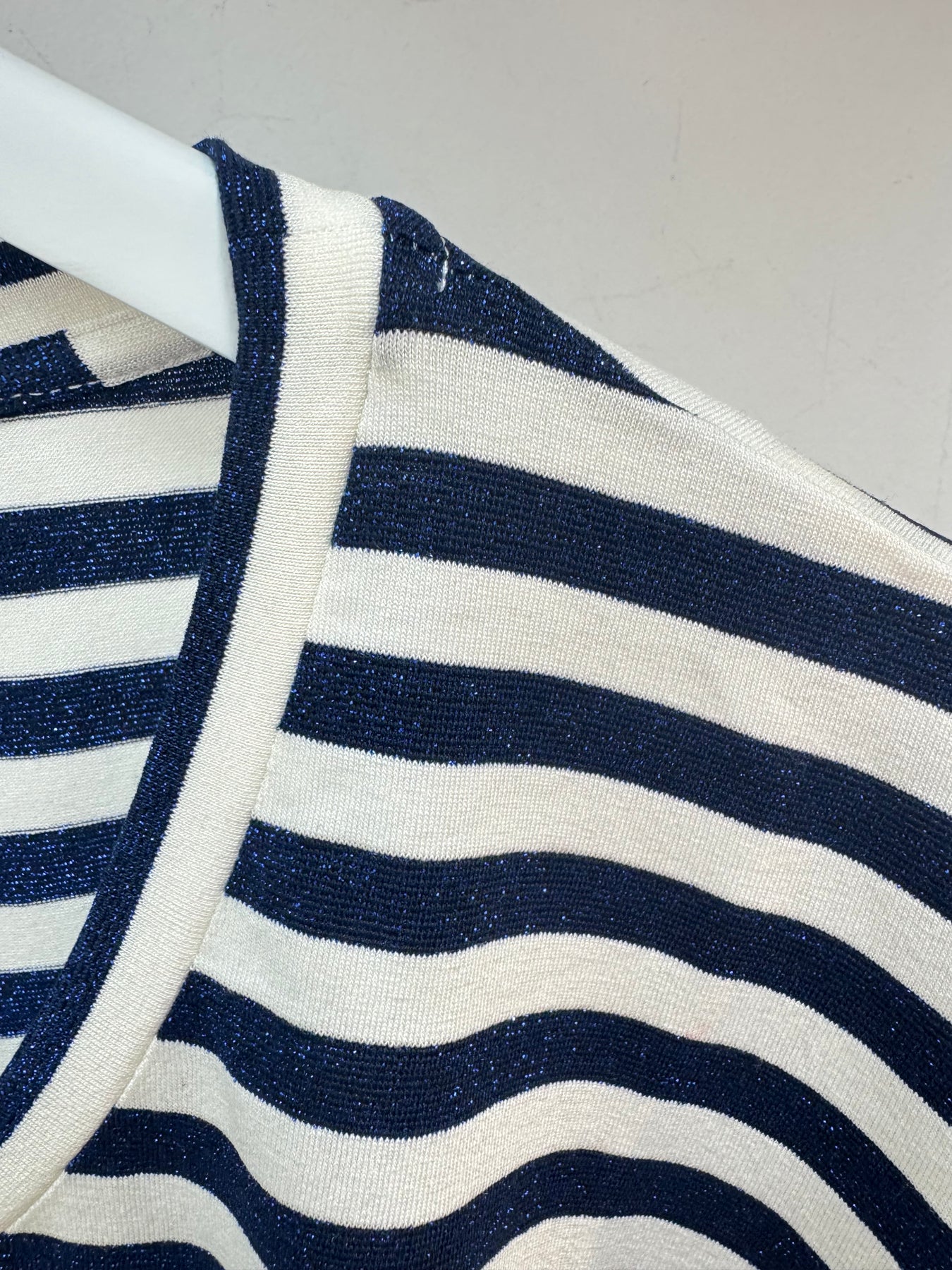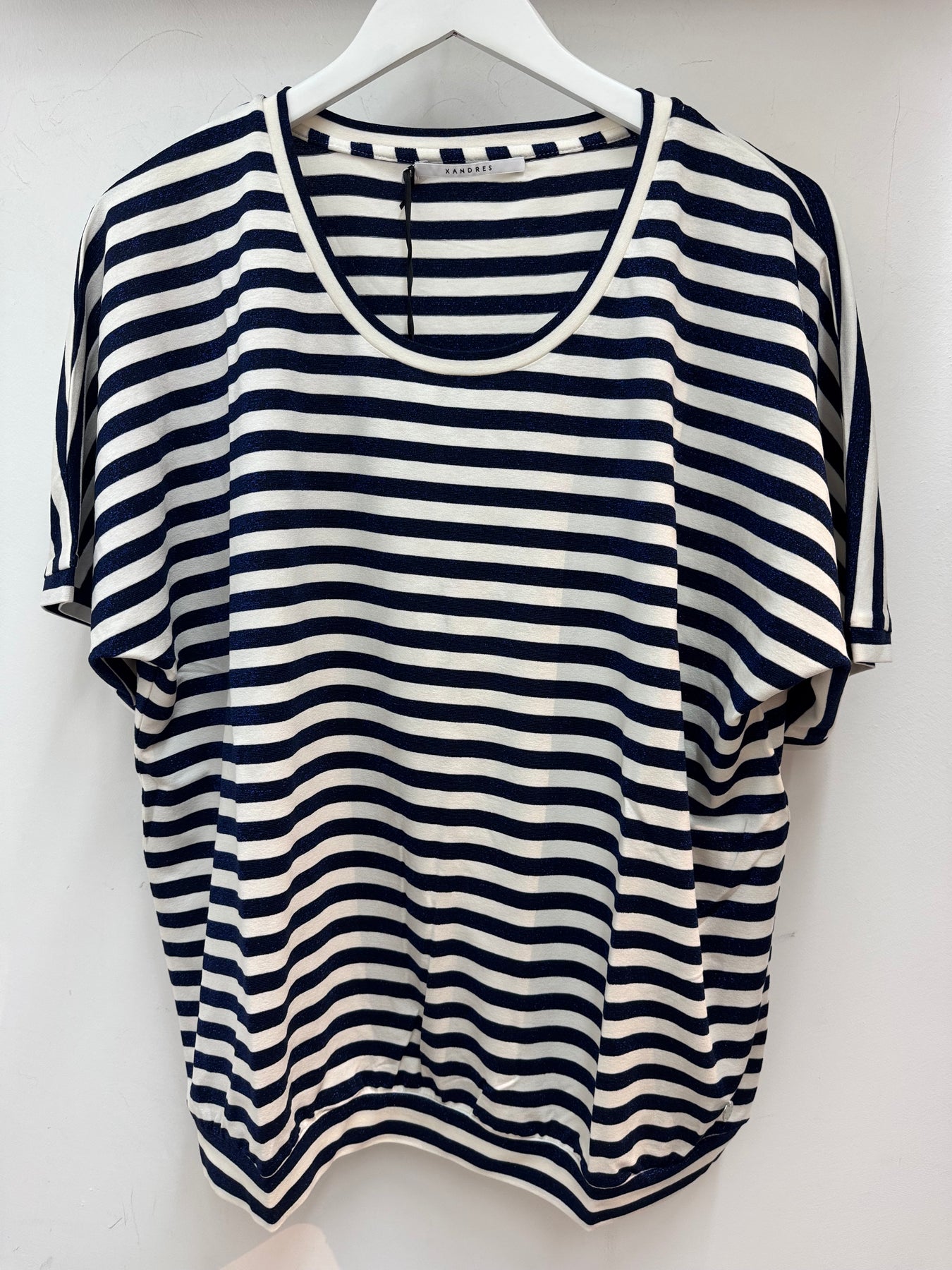 Deze prachtige gestreepte T-shirt van het Belgische merk Xandres is een absolute topper in onze collectie – en dat al meerdere seizoenen lang. Klanten die het model al kennen, weten het: dit shirt is een favoriet in de garderobe dankzij de perfecte mix van comfort, stijl en veelzijdigheid. Dit seizoen komt het geliefde model terug in drie onweerstaanbare kleurencombinaties: cranberry, zilver en navy. De uitvoering in Navy straalt zowel elegantie als frisheid uit. Ideaal voor het voorjaar, de zomer én nazomer.