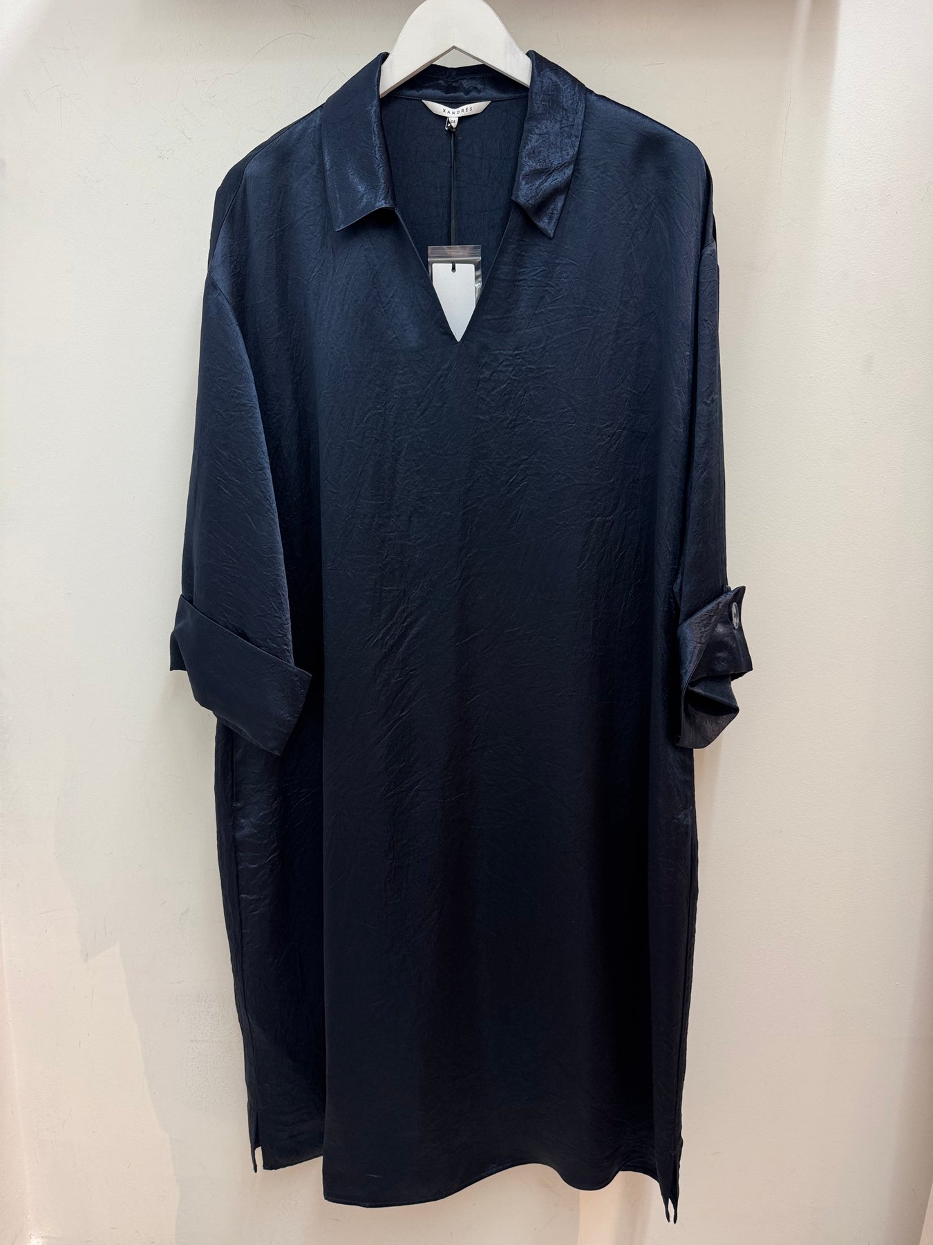 Draag deze jurk solo met een sneaker of een hak, of style ze af met de bijpassende navy blouse of broek uit dezelfde ‘wrinkled shiny acetaat’ reeks voor een elegante coördinerende look. Ook los gecombineerd met andere items uit je garderobe laat deze jurk zich makkelijk stylen dankzij de neutrale maar verfijnde uitstraling van het materiaal.