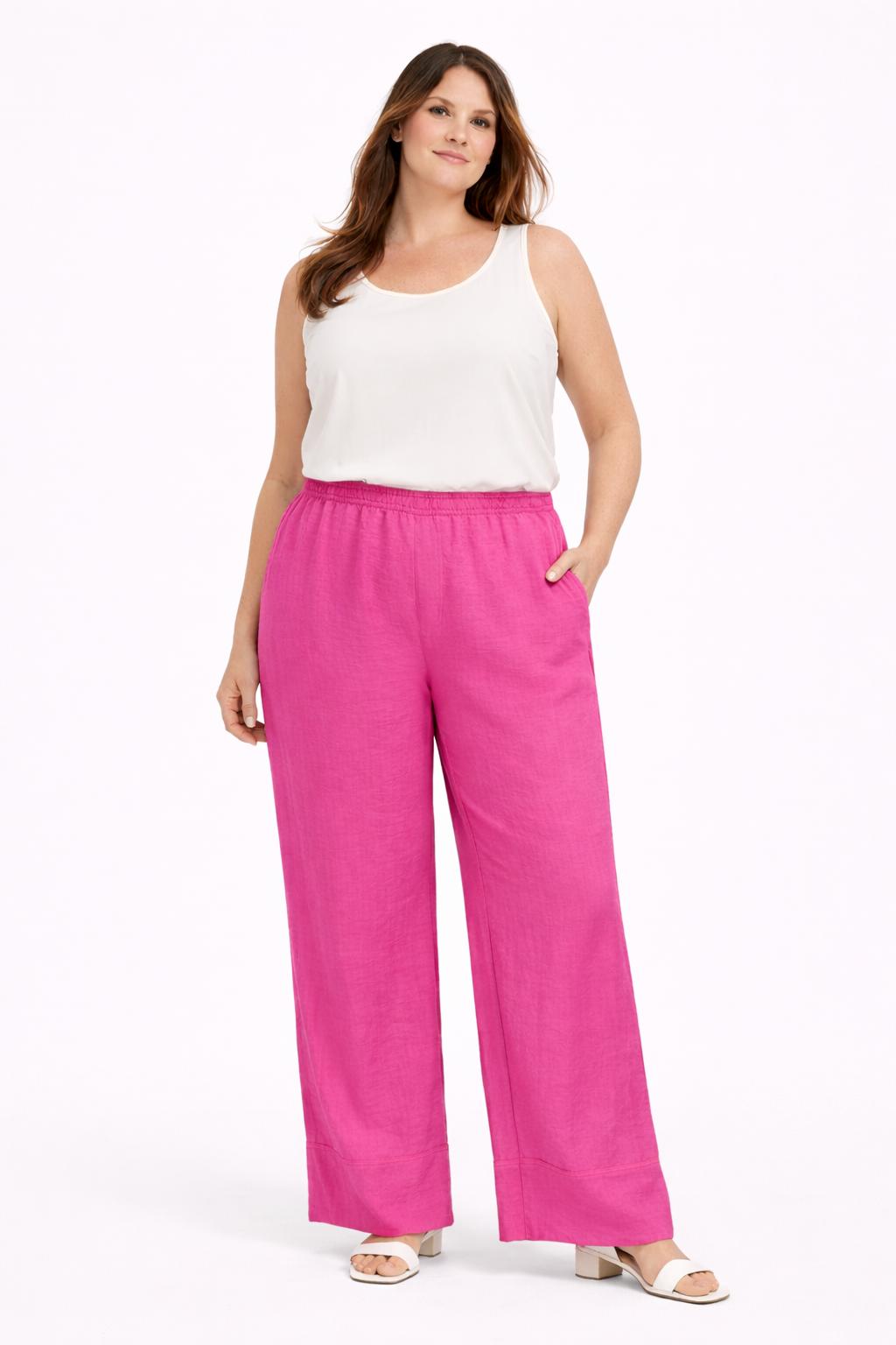 Deze fuchsia wide leg broek is een echte eyecatcher binnen grote maten dameskleding en perfect voor vrouwen die houden van plussize fashion met lef, kleur en comfort. Binnen dameskleding grote maten is dit een opvallend maar draagbaar item dat moeiteloos stijl en gemak combineert. Dankzij de soepele, geweven stof voelt deze broek licht en aangenaam aan, wat hem ideaal maakt als comfortabele plussize kleding voor uiteenlopende gelegenheden. Dit ontwerp past perfect bij kleding voor vrouwen met rondingen die hun curvy stijl graag krachtig en vrouwelijk neerzetten.