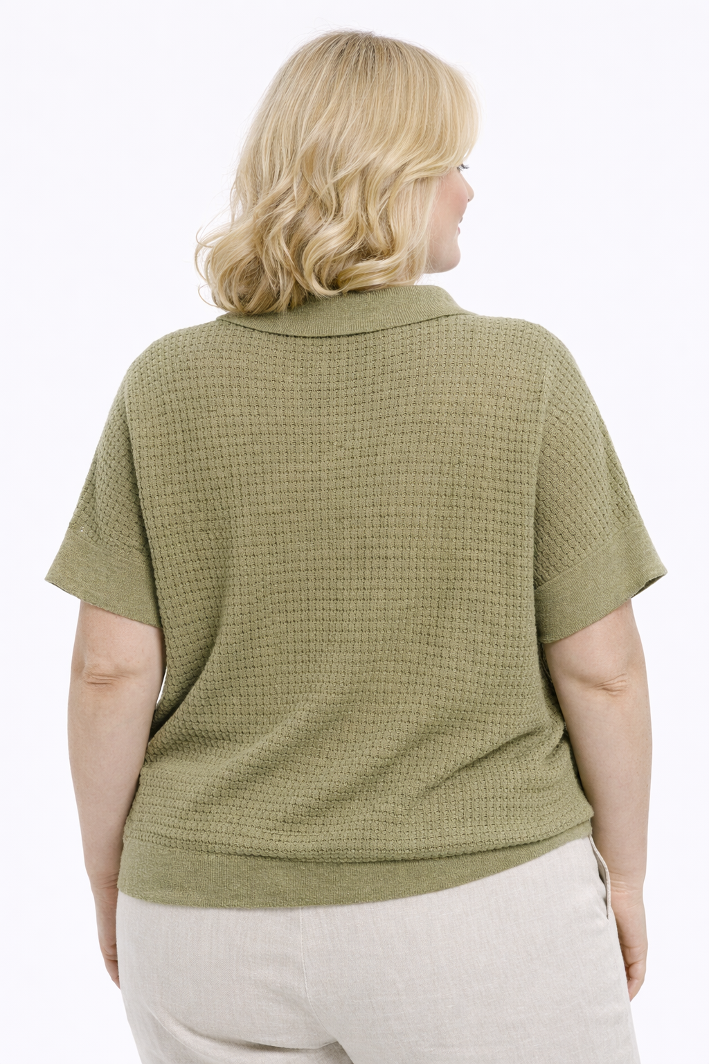 Het model heeft een elegante polokraag met een vrouwelijke V-halsuitsnijding, waardoor het perfect combineert met zowel een geklede broek als een casual short of rok. De trui valt soepel rond het lichaam en is licht oversized, ideaal voor vrouwen met rondingen die houden van stijlvolle mode zonder in te boeten op comfort. De korte mouwen zijn mooi afgewerkt met een gebreide boord die de look extra verfijnt. De boord aan de zoom zorgt ervoor dat het model mooi in vorm blijft.