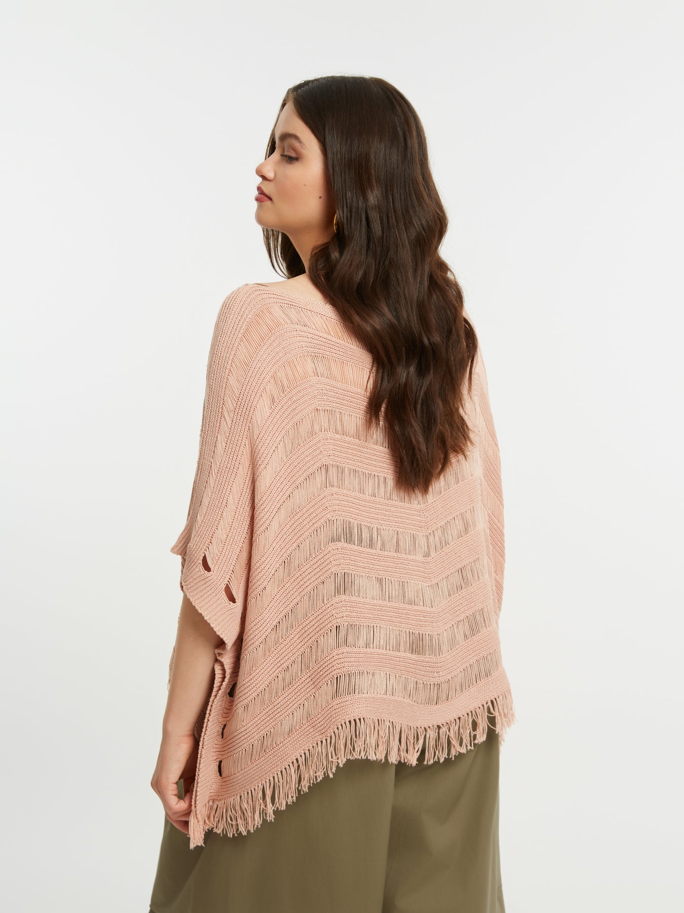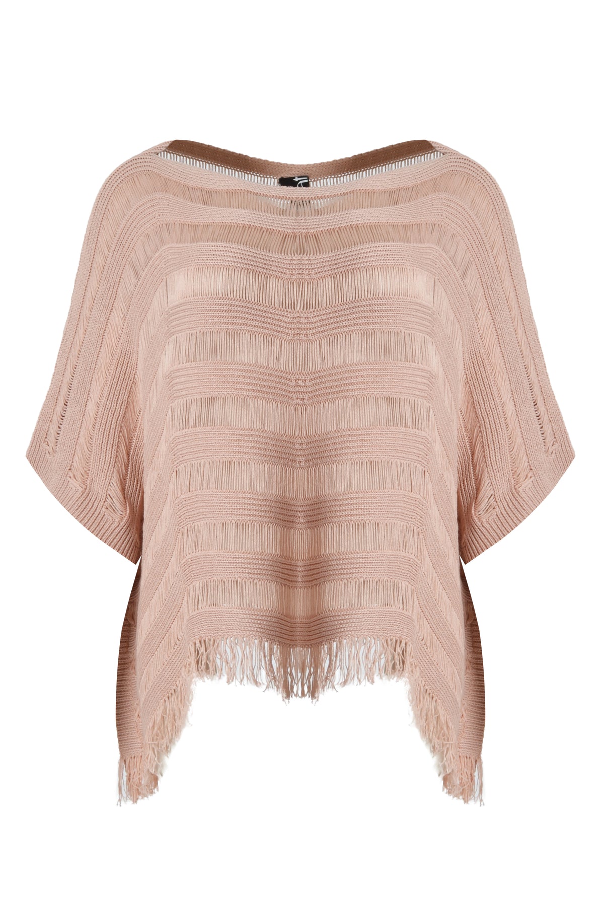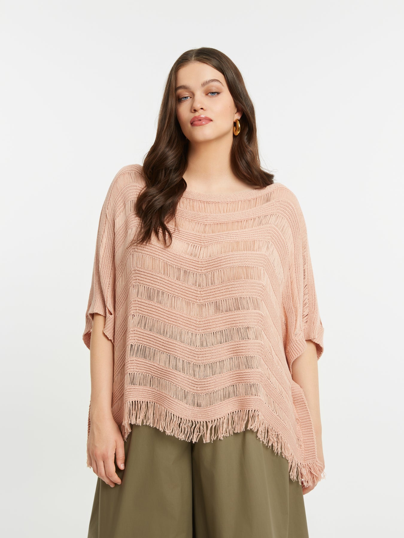 De zachte poederroze tint straalt vrouwelijkheid en verfijning uit en laat zich prachtig combineren met neutrale tinten zoals wit, beige of taupe. De halslijn valt soepel en licht boothalsachtig, wat zorgt voor een elegante uitstraling rond de schouders. De mouwen lopen vloeiend over in het lichaam en creëren een los, comfortabel silhouet dat ideaal is voor kleding voor vrouwen met rondingen. De lengte bedraagt ongeveer 57 cm zonder franjes en 64 cm wanneer je de fijne franjes onderaan meerekent. Die subtiele franjes geven extra beweging en een speelse boho-touch aan het geheel.